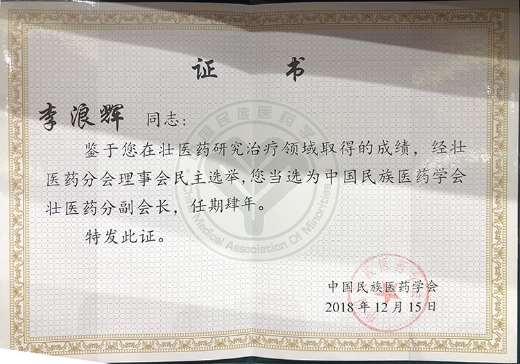 熱烈慶祝,12月15日,強(qiáng)壽集團(tuán)董事長李浪輝因壯醫(yī)藥研究治療領(lǐng)域取得的成績,經(jīng)壯醫(yī)藥分會理事會民主選舉,當(dāng)選為中國民族醫(yī)藥學(xué)會壯醫(yī)藥分會副會長!!!