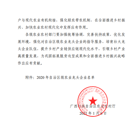 2021年1月6日 ,廣西壯族自治區(qū)農(nóng)業(yè)農(nóng)村廳公布了最新的2020 年自治區(qū)級農(nóng)業(yè)龍頭企業(yè)名單,其中包括 14個市的115家企業(yè)。本次遴選由各市農(nóng)業(yè)農(nóng)村局、自治區(qū)農(nóng)業(yè)農(nóng)村廳組織專家評審和公示,并最終決定。因廣西強壽藥業(yè)集團(tuán)強化“龍頭企業(yè)+企業(yè)+基地+農(nóng)戶”的模式帶動周邊農(nóng)戶從事中草藥種植,扶助農(nóng)民走上致富之路成績顯著。本次榮獲“自治區(qū)級農(nóng)業(yè)龍頭企業(yè)”殊榮。
