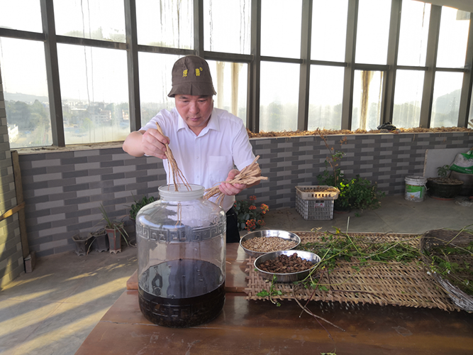 壯藥整骨水的配制是經(jīng)歷代祖?zhèn)魉幏脚c長時間行醫(yī)診治的實踐經(jīng)驗相結(jié)合,將多種地道中草藥通過嚴(yán)格配比制備而成。壯藥整骨水的傳承人之一李燮中,男,蒼梧人,出生于岐黃世家,自小隨祖上學(xué)醫(yī),精通醫(yī)藥。為傳承民間醫(yī)術(shù),其子李燕強(qiáng)從小就跟隨在李燮中身邊從醫(yī)學(xué)藥,親歷傳授,李燮中把祖上的藥方和行醫(yī)經(jīng)驗傳授給李燕強(qiáng),再由李燕強(qiáng)傳授給李浪輝。李燮中于1981年在蒼梧創(chuàng)立了本地第一間藥店—福樂藥店(強(qiáng)壽藥業(yè)集團(tuán)的前身),藥店為蒼梧涼茶的發(fā)展和民間傳統(tǒng)醫(yī)藥的傳承起到了承上啟下的貢獻(xiàn),造福當(dāng)?shù)匕傩铡@罾溯x從小就隨著祖父李燮中和父親李燕強(qiáng)一起從醫(yī)學(xué)藥,并樹立了要發(fā)展、壯大、振興民族醫(yī)藥產(chǎn)業(yè)的決心。李浪輝時常與家人行走在山間田野采摘草藥,并做成相應(yīng)的標(biāo)本,用于進(jìn)行各種藥物的臨床研究與探索,對傳統(tǒng)醫(yī)藥有著傳承與發(fā)展的強(qiáng)烈責(zé)任感,尤其是對民間醫(yī)藥非物質(zhì)文化遺產(chǎn)的簡、廉、便、效、捷等方面?zhèn)鞒姓莆罩毺氐募记?。?jīng)過祖父、父親的傳承與創(chuàng)新發(fā)展,李浪輝掌握了多項民間傳承的非遺物質(zhì)文化項目及技術(shù)。如:蒼梧桑寄生茶、蒼梧涼茶、壯藥整骨水、整骨器具、椎墊等多項技術(shù)的核心制作技巧,以及獨特的制作工藝。傳統(tǒng)中醫(yī)藥是中華民族獻(xiàn)給世界人民最好的禮物,發(fā)揚國粹,寄望傳承,將歷代的醫(yī)術(shù)傳承下去,造福人類,是岐黃世家李氏家族義不容辭的責(zé)任和使命。